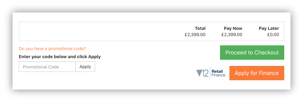 If you offer V12 Finance, there will now be two options at the basket. An option to Proceed to Checkout to facilitate paying by card or making a reservation, and, when applicable, a second option to Apply for Finance. When a customer clicks to apply they now view and select their preferred terms before proceeding to the checkout.